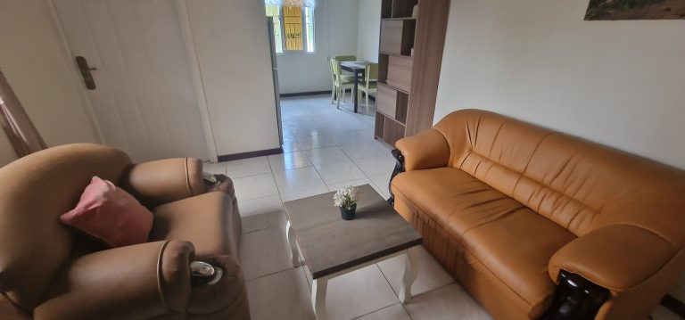 De woonkamer is sfeervol ingericht en voorzien van een flatscreen TV en 2 zitbanken + ventilator.