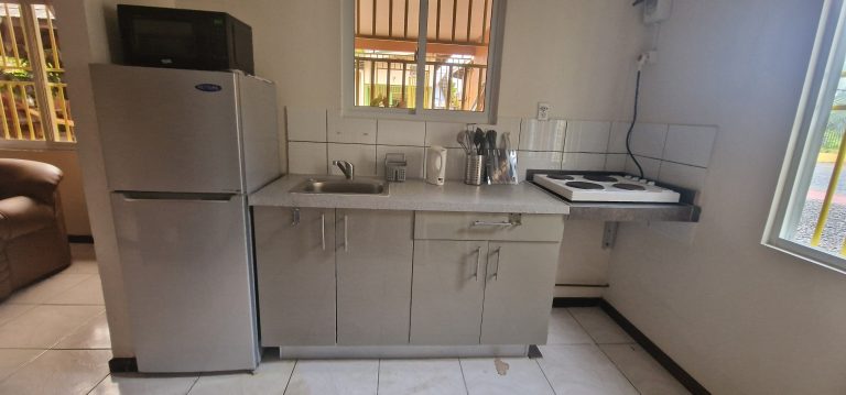 De keuken is voorzien van alle basis benodigde apparatuur zoals een koel-vriescombinatie en kookplaat alsook waterkoker en magnetron.